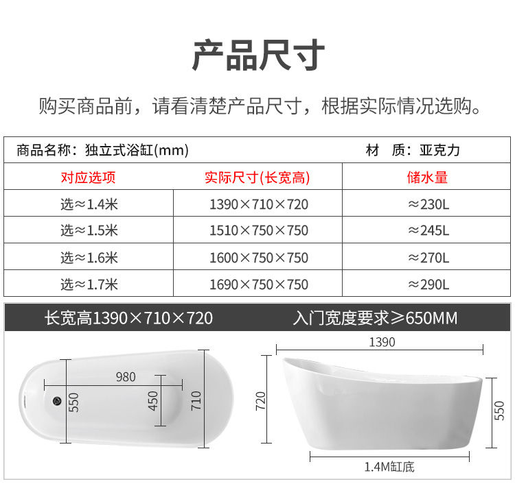 亚克力浴缸家用成人深泡独立式浴盆酒店民宿1.4-1.7米卫生间浴池 型号:BA2204